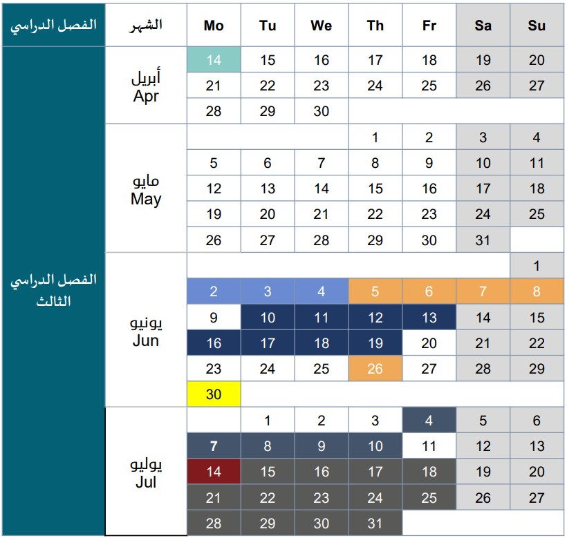 | بدء إجازة الصيف للكادر الإداري والتعليمي | 14 يوليو 2025 |