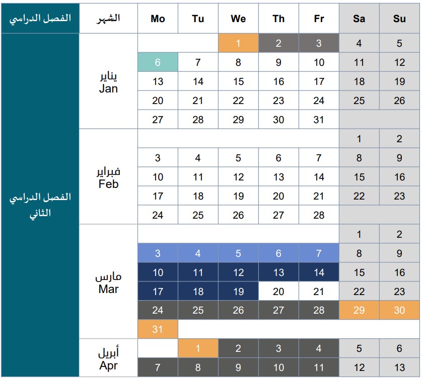 يوضح هذا الجدول تواريخ بدء الدوام، وفترات الإجازات، ومواعيد الاختبارات المختلفة، بما يسهم في تنظيم العملية التعليمية ويتيح للجميع الاستعداد المسبق لكل مرحلة من مراحل العام الدراسي. نأمل أن يكون هذا الجدول دليلاً مرجعياً مفيداً يساعدكم في التخطيط الفعّال ومتابعة المسيرة التعليمية بكل نجاح.