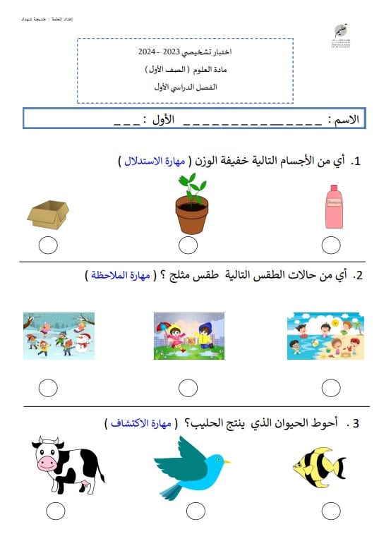 اختبار تشخيصي علوم متكاملة للصف الأول الفصل الأول
