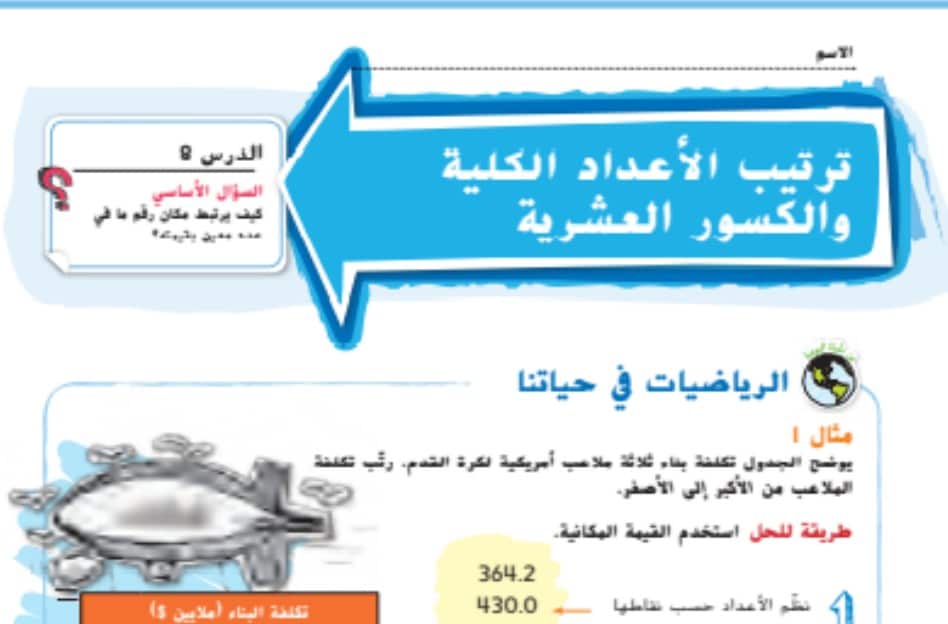 حل درس ترتيب الاعداد الكلية والكسور العشرية للصف الخامس الفصل الاول
